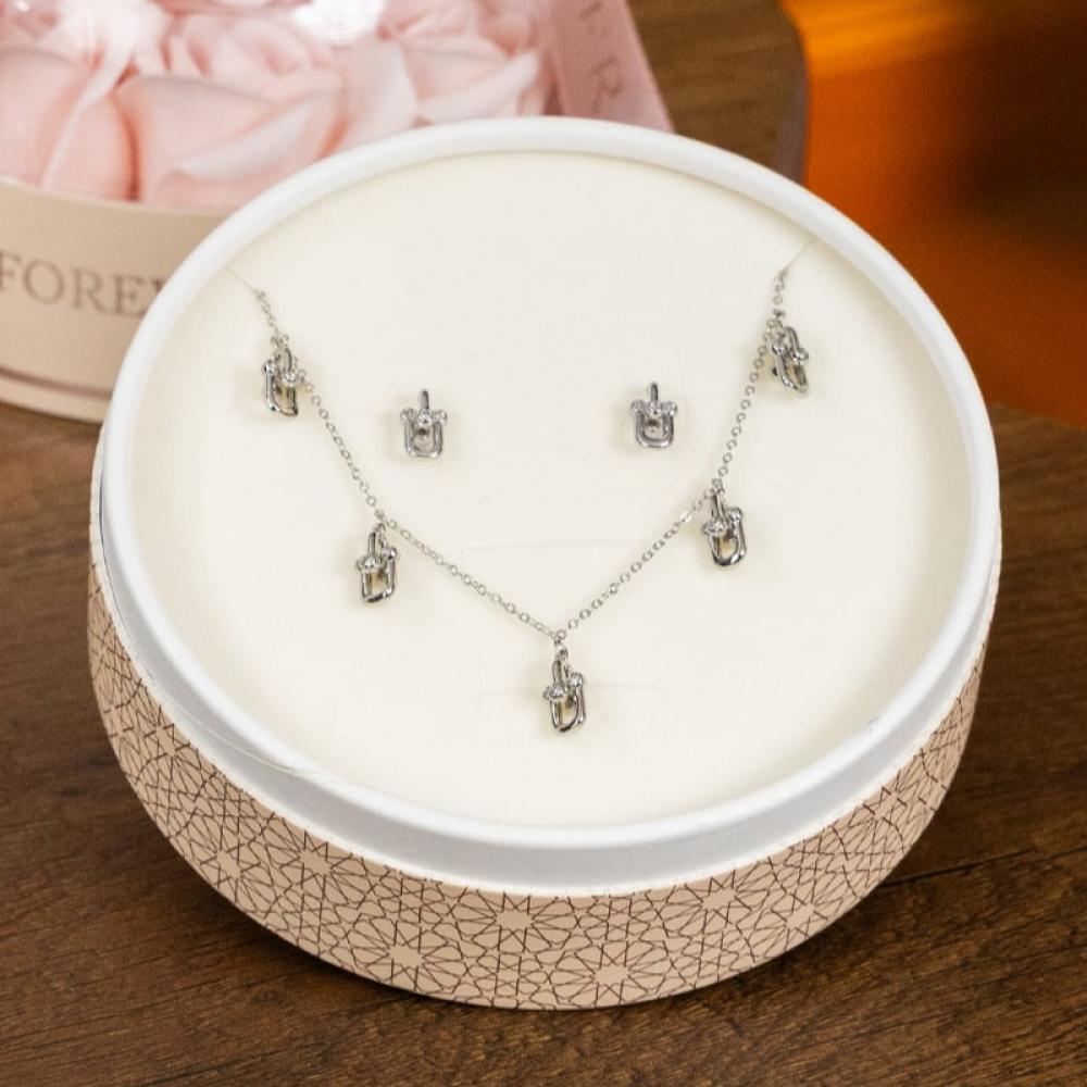 طقم نسائي باهر من سيكلو, سلسال وحلق بتصميم دائري مرصع بأحجار مختلفة الحجم بأشكال جذابة ولامعة, هذا الطقم هو إضافة فريدة ومميزة لمجوهراتك.