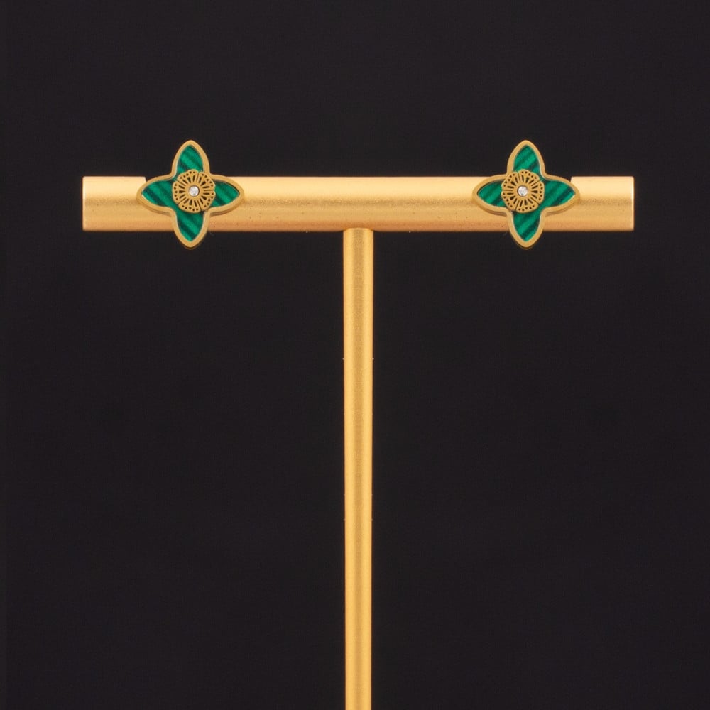 حلق نسائي من سيكلو, حلق فاتن على شكل وردة باللون الأخضر يتوسطه دائرة مزخرفة باللون الذهبي لتضيف للحلق لمسة لامعة, حلق مناسب لكل يوم لإطلالتك النهارية والمسائية.