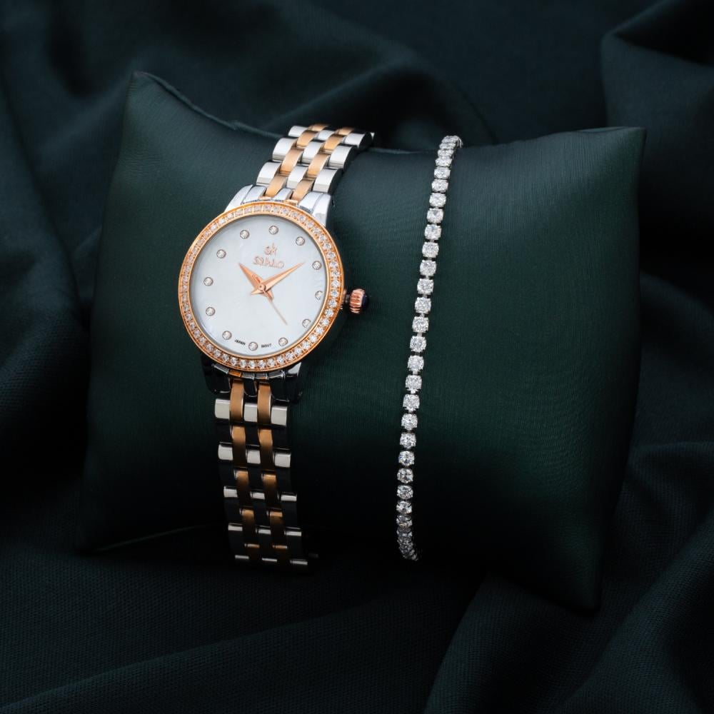 زيني معصمك بأجمل ساعة واسوارة باللون الفضي والنحاسي ميناء ابيض