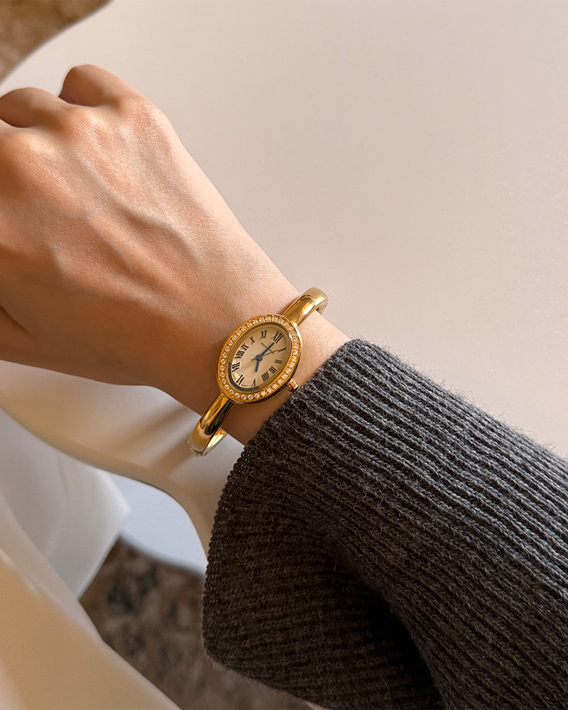 ساعة نسائية فصوص هي الخيار المثالي لكل امرأة تبحث عن لمسة من الأناقة والتميز. ساعة الاناقة فصوص ذهبي تتميز بتصميم بيضاوي أنيق يضفي لمسة من الرقي، حيث تأتي بحواف ناعمة وسير من الستانلس ستيل الذهبي الذي يجمع بين الفخامة والمتانة.