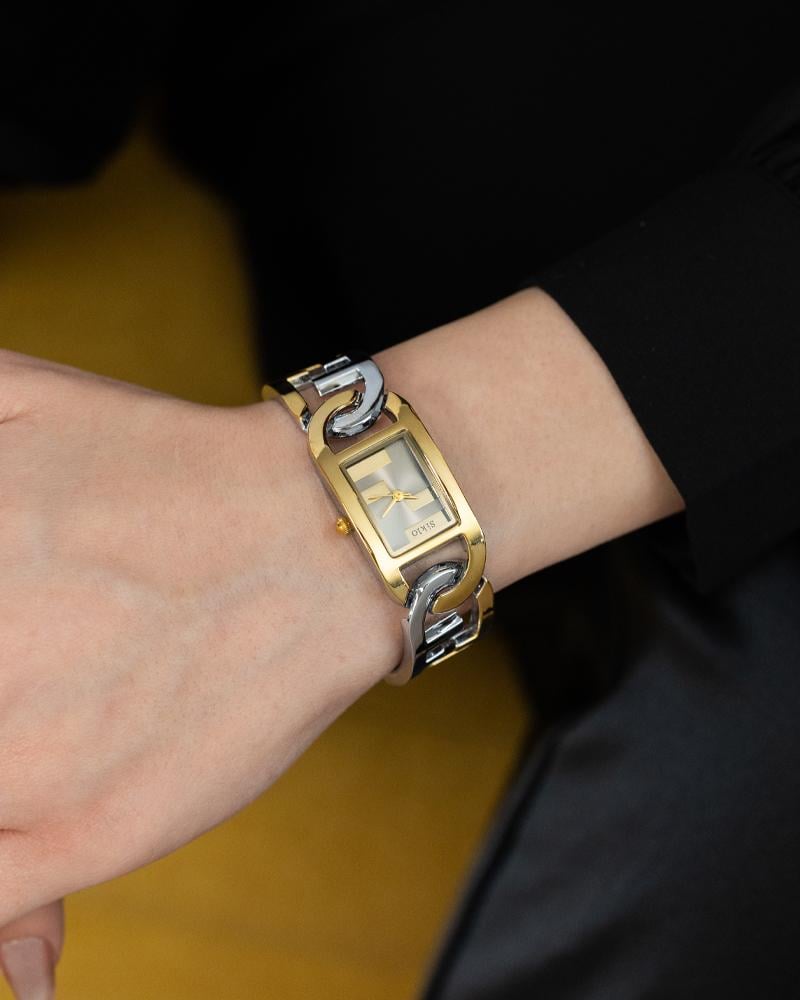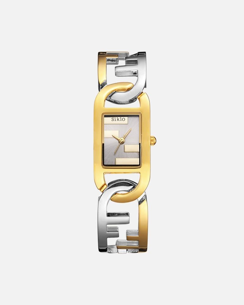 ساعة نسائية أنيقة بتصميم فاخر، تتميز بسوار معدني بملمس محفور يضيف لمسة فريدة. تأتي بقرص دائري ميني صغير مرصع بأحجار لامعة صغيرة عند مؤشرات الساعة، مع عقارب ذهبية أنيقة تضفي انسجامًا مع الإطار الذهبي المصقول. ساعة تحمل طابعًا راقيًا يدمج بين البساطة والفخامة، مناسبة للمناسبات الخاصة والإطلالات الكلاسيكية المميزة.
