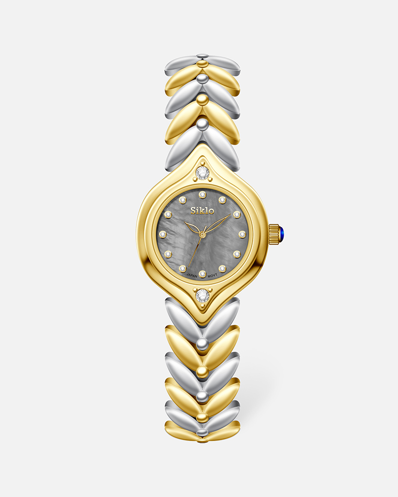 ساعة ... تجسد الفن الراقي والأناقة العصرية. ميناء بيضاوي ناعم يلمع كالضوء في عيون الملوك، أنيقه يحتضنها سوارٌ بتصميم فصوص فريد يشبه قطع الفن المعماري. كل تفصيلة فيها تحكي قصة ترف لا يُضاهى، وكأنها بوابة زمنية إلى عالم من الفخامة الخالدة.