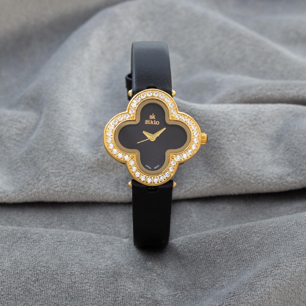 ساعة جلد نسائية بلونها الاسود الذهبي الميناء الاسود