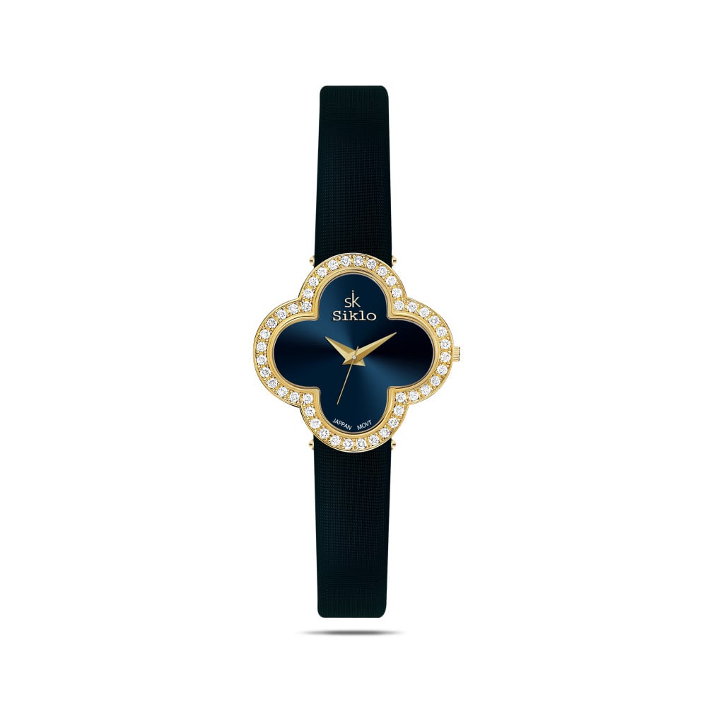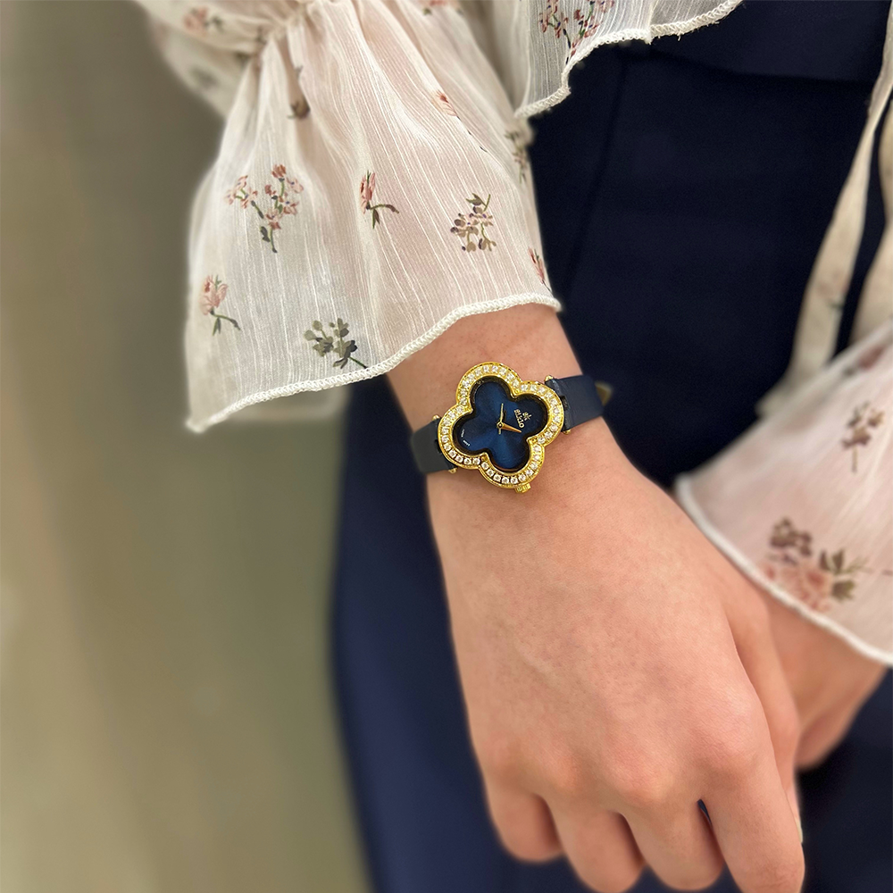 ساعة جلد نسائية بلونها الذهبي الازرق الميناء الازرق