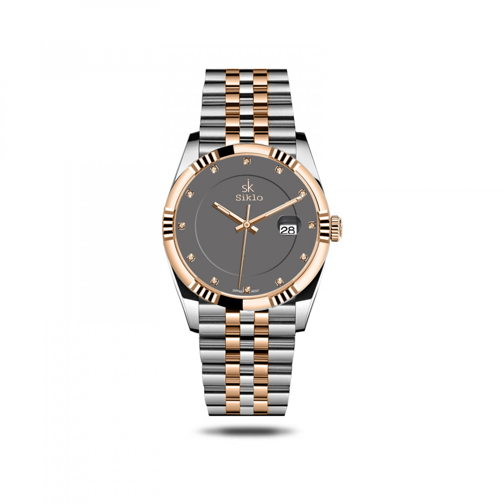 ساعة رجالية من ماركة سيكلو، ساعة رجالية بأناقة مثالية و كلاسيكية، ساعة ستليق بستايلك الرسمي لمناسباتك أو لأناقة يومية، ساعة رجالية بتفاصيل فاخرة نقدمها لك من سيكلو ساعة بسير ستانلس ستيل فخم باللون الفضي مدموج باللون النحاسي الراقي و مينا ملفت باللون الرصاصي و بإطار دائري باللون النحاسي، و تكتمل فخامة الساعة مع تغليف سيكلو يشمل على علبة أنيقة باللون الأبيض مطبوع عليها سيكلو باللون الذهبي و كيس بشعار سيكلو يصلك عند طلبك لهذه الساعة، هذه الساعة هي الخيار المفضل و الأول عند الكثير من الرجال في إطلالاتهم الرسمية و المهمة، ساعة ستناسب جميع أوقاتك وستشعر بمنتهى الأناقة و الرقي عند إرتدائها.