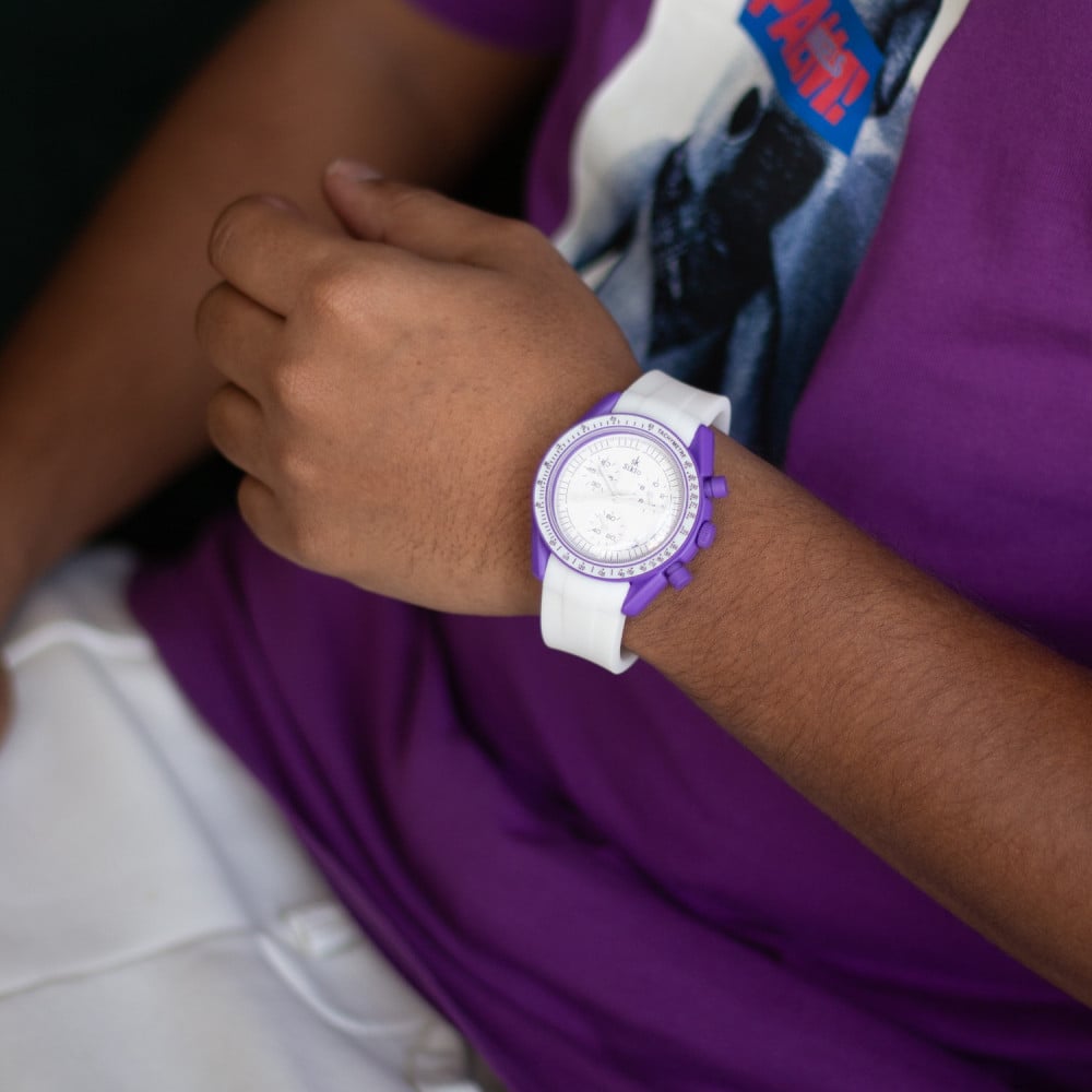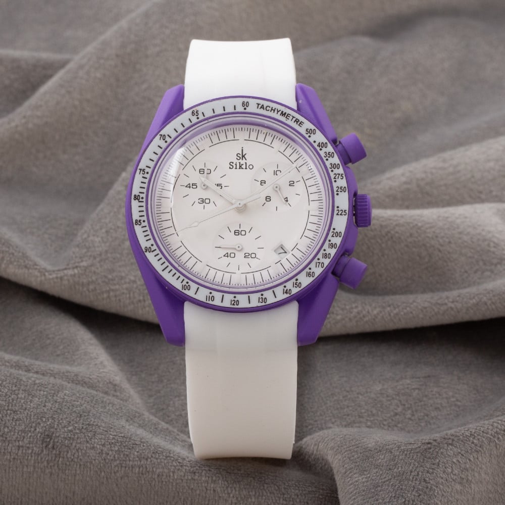 ساعة أوكتا تعطيك شعور المثالية ملائمة لأطلالة عصرية أو مناسبة رسمية، ساعة بإطار بنفسجي دائري ومينا باللون الابيض بحركة عقارب ثلاثية وسوار ربل أبيض، ساعة مصنوعة بدقة لأجلك.