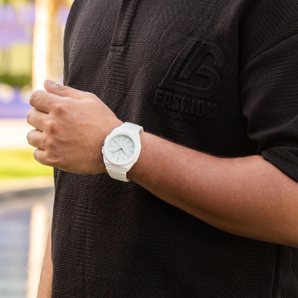 ساعة كربون تتميز بخفتها باللون ابيض و تفاصيلها الملفتة و حركة دقيقة ومميزة