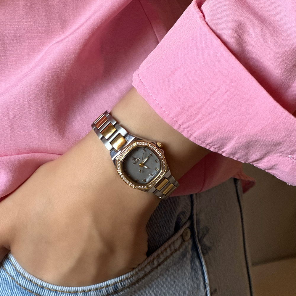 ساعة نسائية باللونين الذهبي والفضي ميناء رصاصي