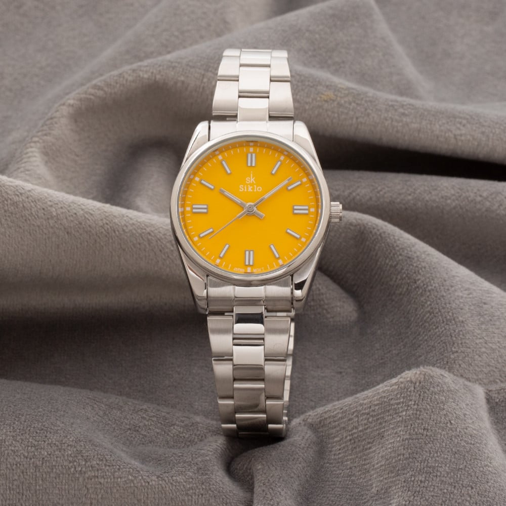 ساعة بستايل كلاسيكي بتفاصيل دقيقة، سوار ستيل باللون الفضي الراقي ومينا أصفر باهي يزيدك جاذبية، الساعة تأتيك في علبة مصممة لكِ بشكل أنيق، ساعة مناسبة لكل يوم.