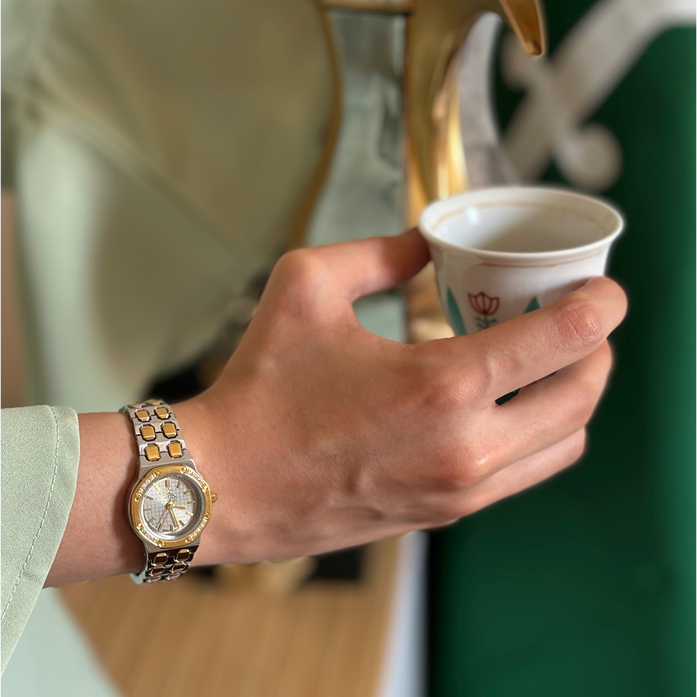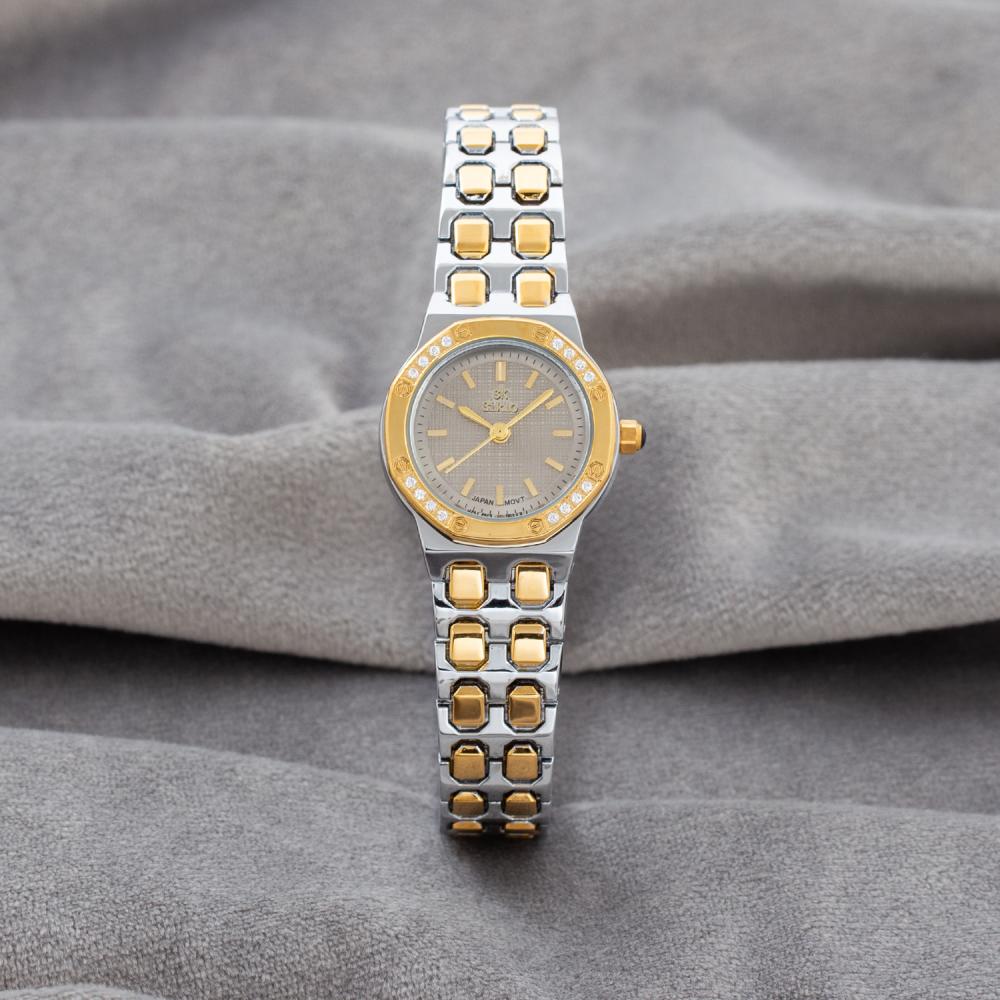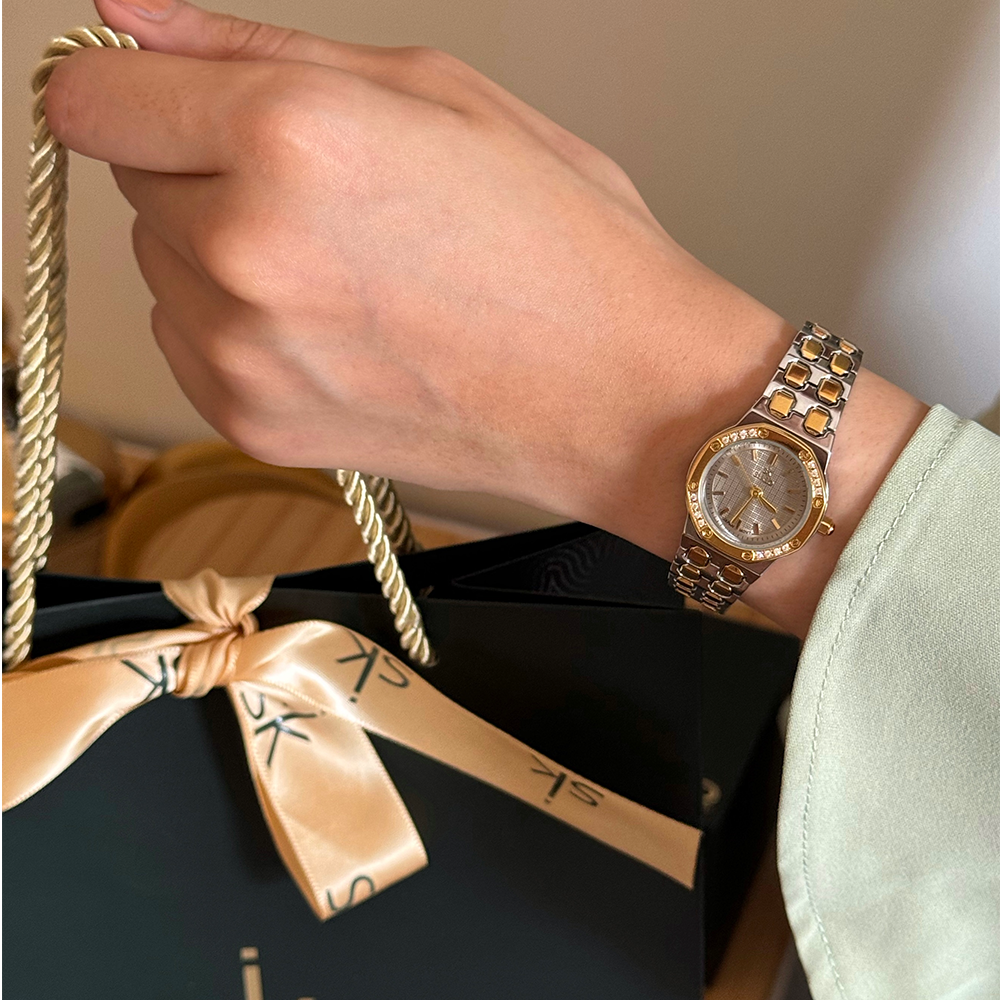 تأتي الساعة بسير مصنوع من الستانلس ستيل الفاخر، مما يمنحها لمسة من الفخامة والمتانة. لونها المكس الرصاصي يضفي عليها جاذبية خاصة، بينما تضيف العقارب الذهبية لمسة من التألق. المينا مزين بخطوط رفيعة، مما يمنحك مظهرًا مذهلاً وساحرًا.