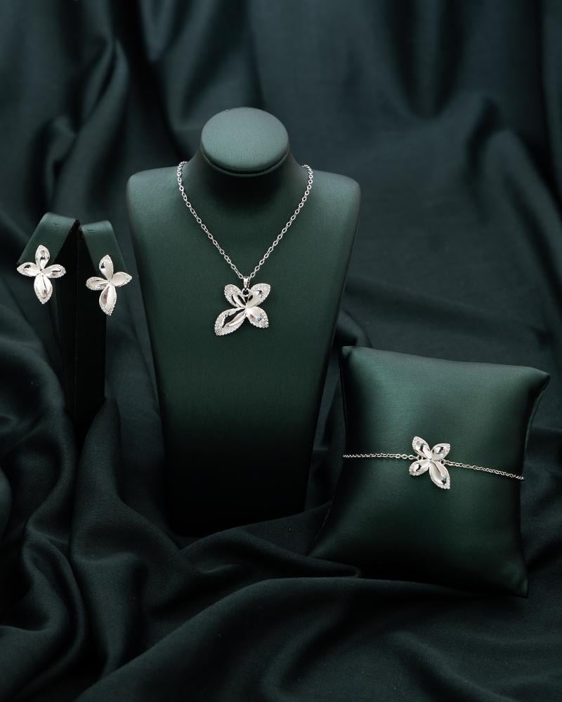 طقم إكسسوار نسائي يأسر العيون بجماله، أنيق، إسوارة فاخرة، حلق متألّق وخاتم جذاب، كلها مرصعة بفصوص الزركون التي تشع ببريق ناعم كالضوء المنعكس على الماء. تصميم أنيق ومتناغم يمنحك لمسة ملكية في كل مناسبة، وكأنك ترتدين لحظة من السحر.