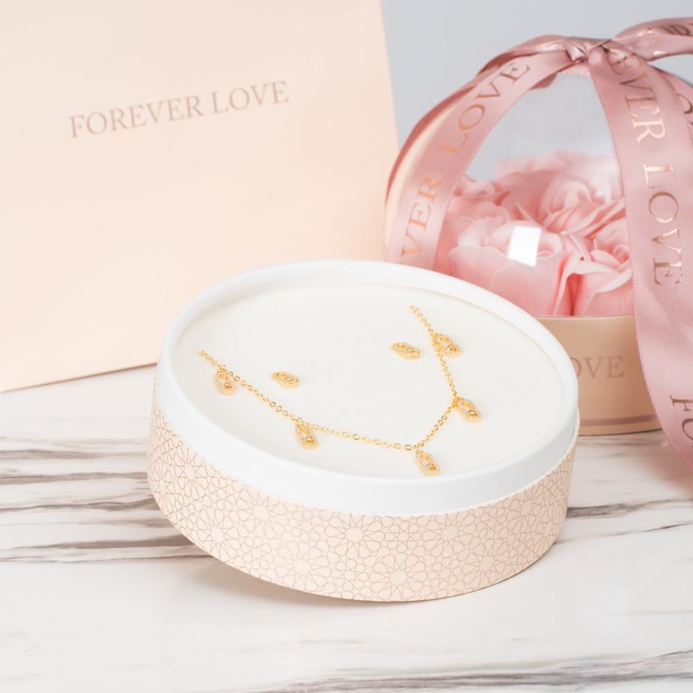 طقم نسائي باهر من سيكلو, سلسال وحلق بتصميم دائري مرصع بأحجار مختلفة الحجم بأشكال جذابة ولامعة, هذا الطقم هو إضافة فريدة ومميزة لمجوهراتك.