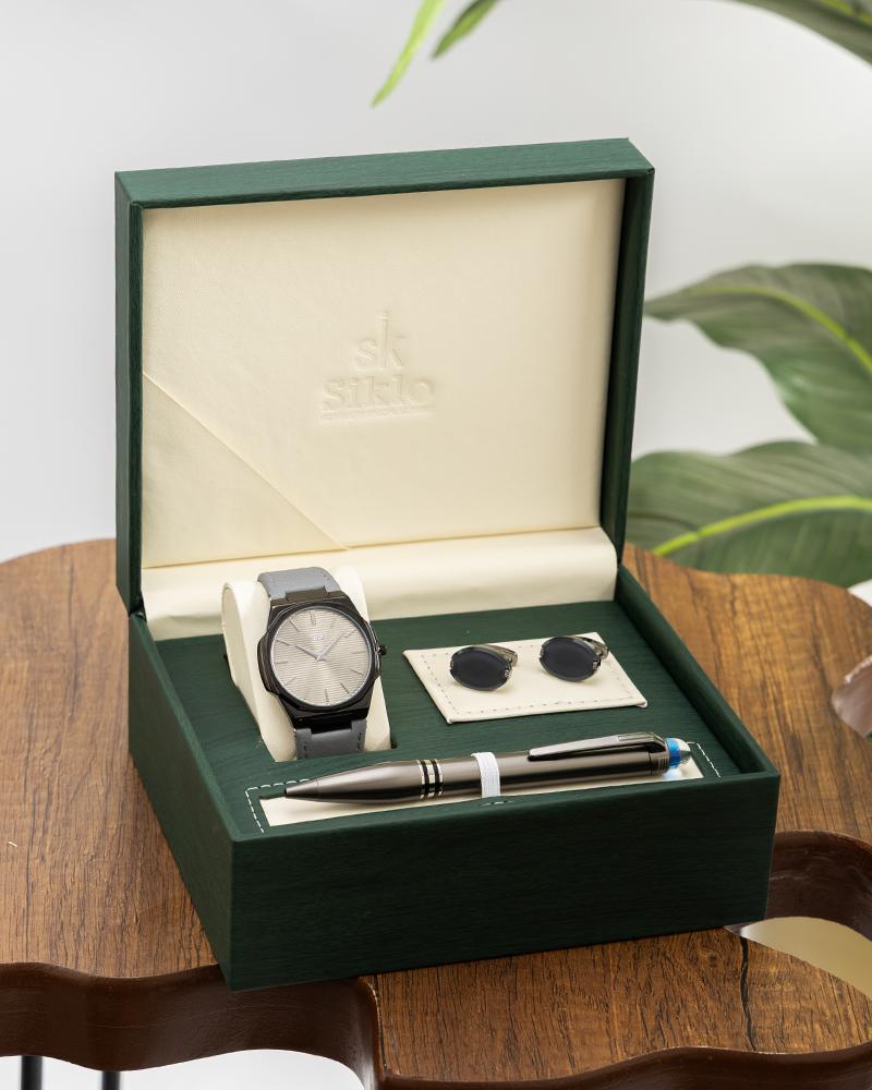 هذا الطقم مصمم بفخامة لكل رجل من سيكلو، ساعة بتصميم جذاب وقلم بتفاصيل ملفتة وكبك يخطف النظر تأتيك هذه المجموعة في علبة أنيقة الشكل، طقم بتفاصيل رائعة للاستخدام الشخصي أو لإهدائها كهدية لشخص عزيز عليك.
