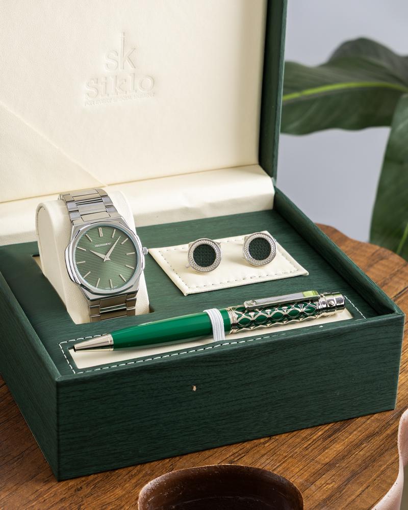 أستعد لإطلالة مميزة مع هذا الطقم من سيكلو, ،طقم يأتيك في علبة بتفاصيل إبداعية بثلاث منتجات مميزة من سيكلو ساعة بتصميم فاخر وقلم بتفاصيل أنيقة وكبك ساحر يليق بإطلالتك في مناسباتك الرسمية مع هذا الطقم مظهرك بيزيد فخامة .