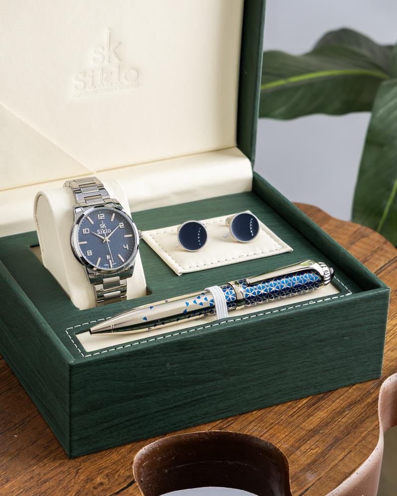 أستعد لإطلالة مميزة مع هذا الطقم من سيكلو, ،طقم يأتيك في علبة بتفاصيل إبداعية بثلاث منتجات مميزة من سيكلو ساعة بتصميم فاخر وقلم بتفاصيل أنيقة وكبك ساحر يليق بإطلالتك في مناسباتك الرسمية مع هذا الطقم مظهرك بيزيد فخامة .