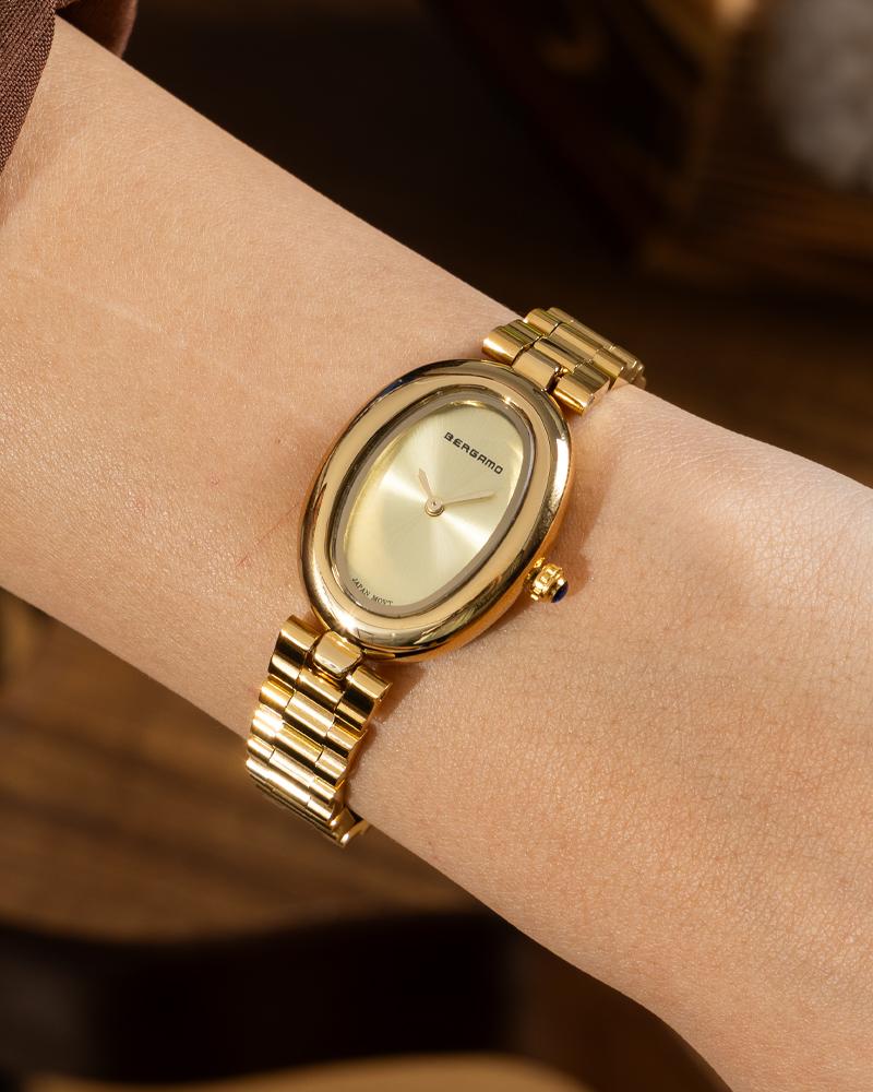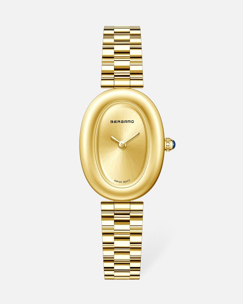 ساعة BERGAMO الذهبية... لمسة من الفخامة اللامتناهية، تصميم بيضاوي أنيق لامع ينبض بالأناقة، وسوار معدني يلتف حول المعصم كأنامل الملوك. قطعة زمنية كأنها مجوهرات من عالم الأحلام.