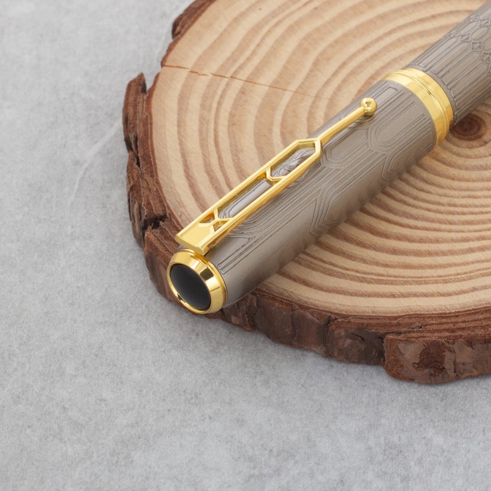 يتميز القلم بتصميم كلاسيكي بحليه مميزه بلون الرصاصي والذهبي
